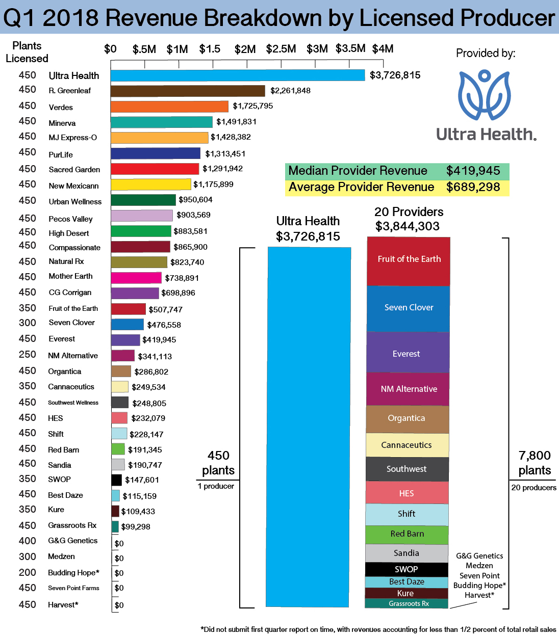 Ultra Health’s first quarter patient sales for 2018 were equivalent to the combined total patient sales of nearly 20 licensed producers in the same quarter. Five licensed producers reported no retail sales in the first quarter of 2018 but some wholesale activity was reported.