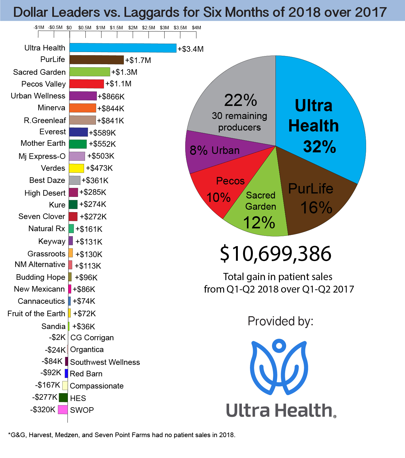 The New Mexico medical cannabis industry surged by $10.7 million in the first six months of 2018 versus the comparable period in 2017. Ultra Health and PurLife combined for 48 percent of the statewide new retail business in 2018. Measured alone, Ultra Health’s revenue gain in 2018 exceeded the combined total of over 31 producers’ revenue growth for the same period.