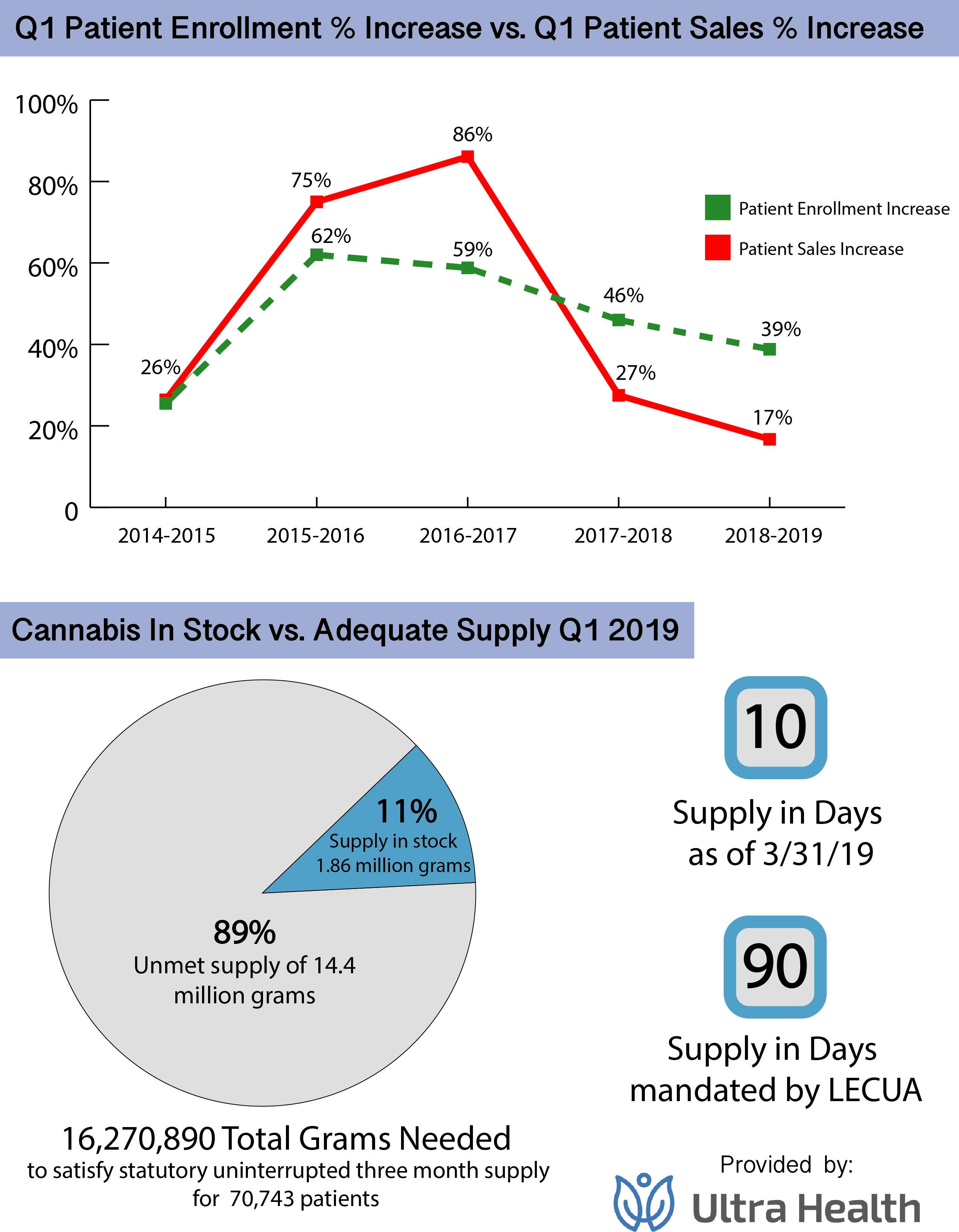 By the end of the first quarter, the Medical Cannabis Program’s supply levels were significantly below statutory requirements. While the definition of adequate supply in the Lynn and Erin Compassionate Use Act mandates the uninterrupted availability of cannabis for a period of three months, patients only had a 10-day supply of medical cannabis at March 31, 2019.